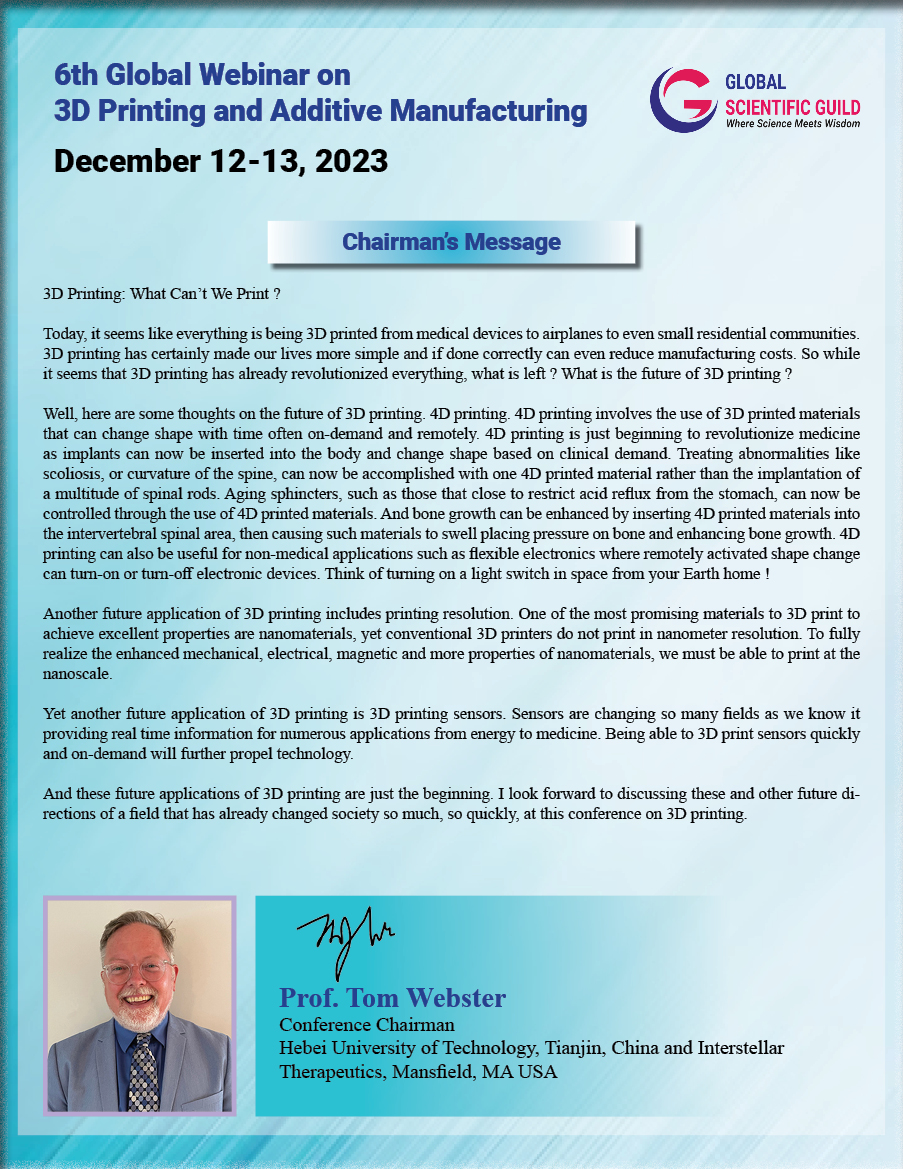 After the grand success of five global conferences, Global Scientific Guild is delighted to announce "6th Global Webinar on 3D Printing and Additive Manufacturing" which will be held during December 12-13, 2023 as a live online event.